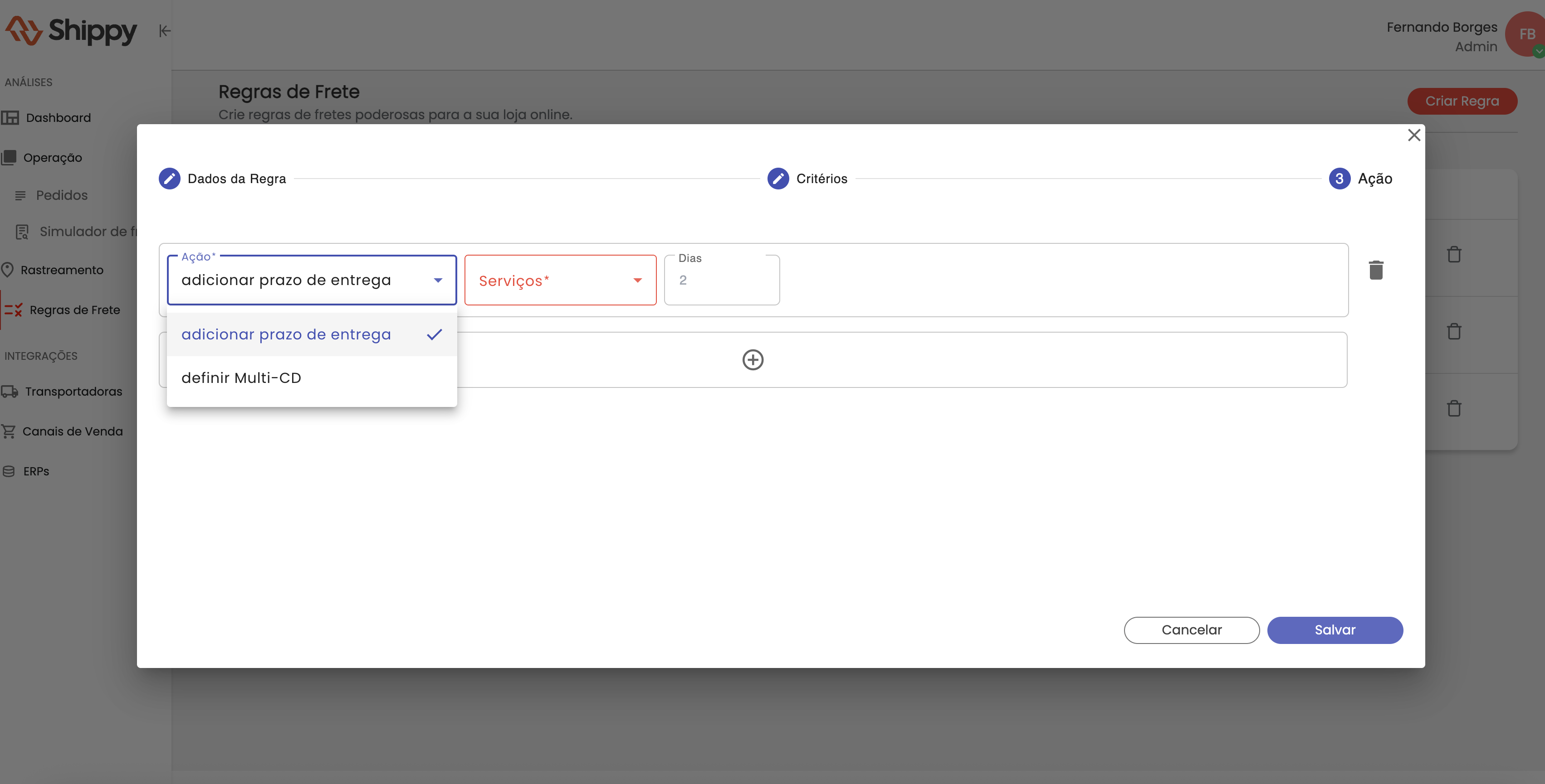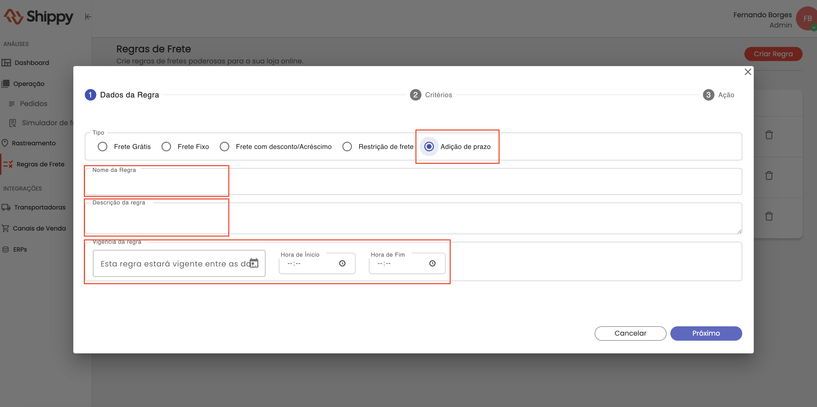 Após informar ou não os critérios, clique em "Próximo" para configurar o prazo. Escolha a opção "Adicionar prazo de entrega", escolha os serviços de entrega que receberão o acréscimo de prazo e informe a quantidade de dias. Após isso é só clicar em "Salvar" e pronto!